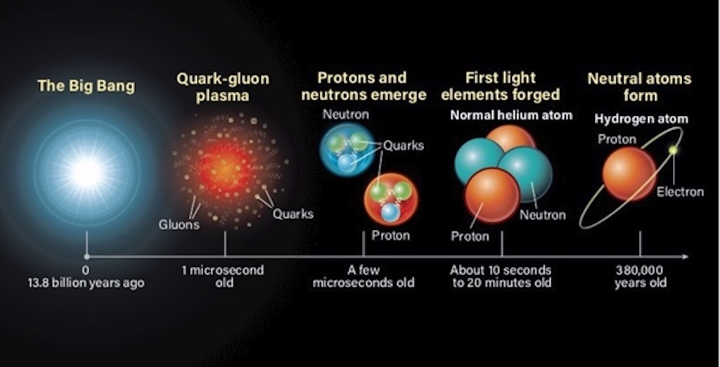 - And the “cosmic dawn” (reionisation) is the first moment that starlight appears (370,000 years after the Big Bang. Video of the formation and evolution of the first stars and galaxies in a virtual universe similar to our own. This is a short simulation that begins just before cosmic dawn, when the universe is devoid of starlight, and runs to the epoch 550 million years after the Big Bang. You see stars forming, that then explode as supernovas, and the nuclear products that have been synthesised in those stars become pollutants in space, and form the next generation of stars. And this leads to the chemistry we know today (and to life as well).