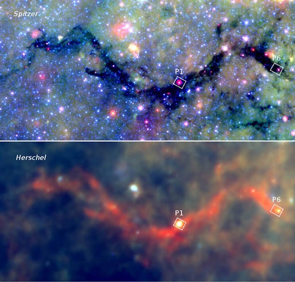 The lower panel was taken by Herschel covers the far-infrared to sub-millimetre (~5.5 THz down to ~450 GHz), and we see the nebula glows due to emission from cold dust. The two boxed regions, P1 and P6, were examined in more detail by the Sub-millimeter Array.